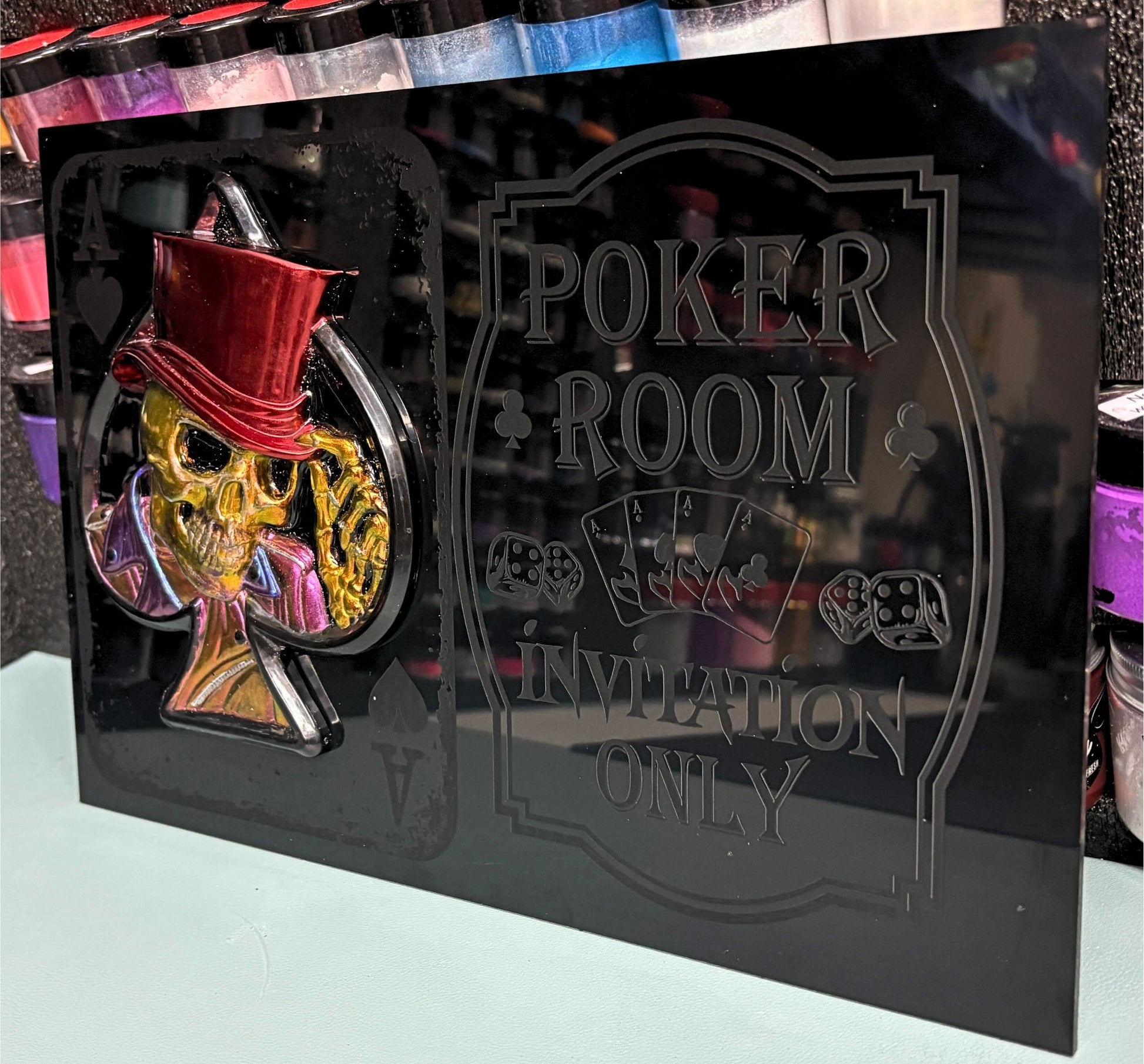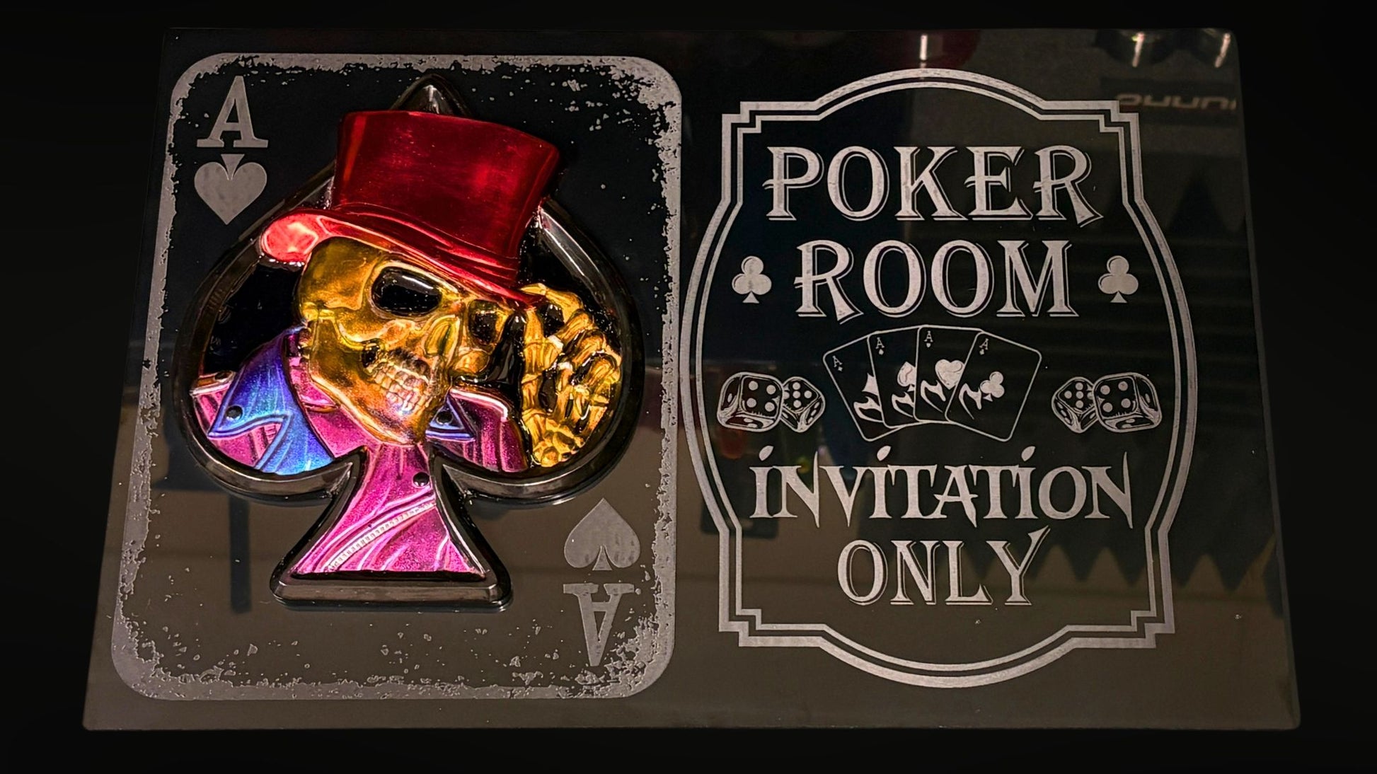 The sign is crafted from sleek 2mm black acrylic with precision-engraved lettering and classic card suit symbols. Front and center is a striking 3D Ace of Spades skull, hand-cast in black polyurethane resin and finished with shimmering mica powders. Wearing a vivid red top hat and colorful attire, the skull brings a fun mix of eerie and playful that instantly grabs attention.