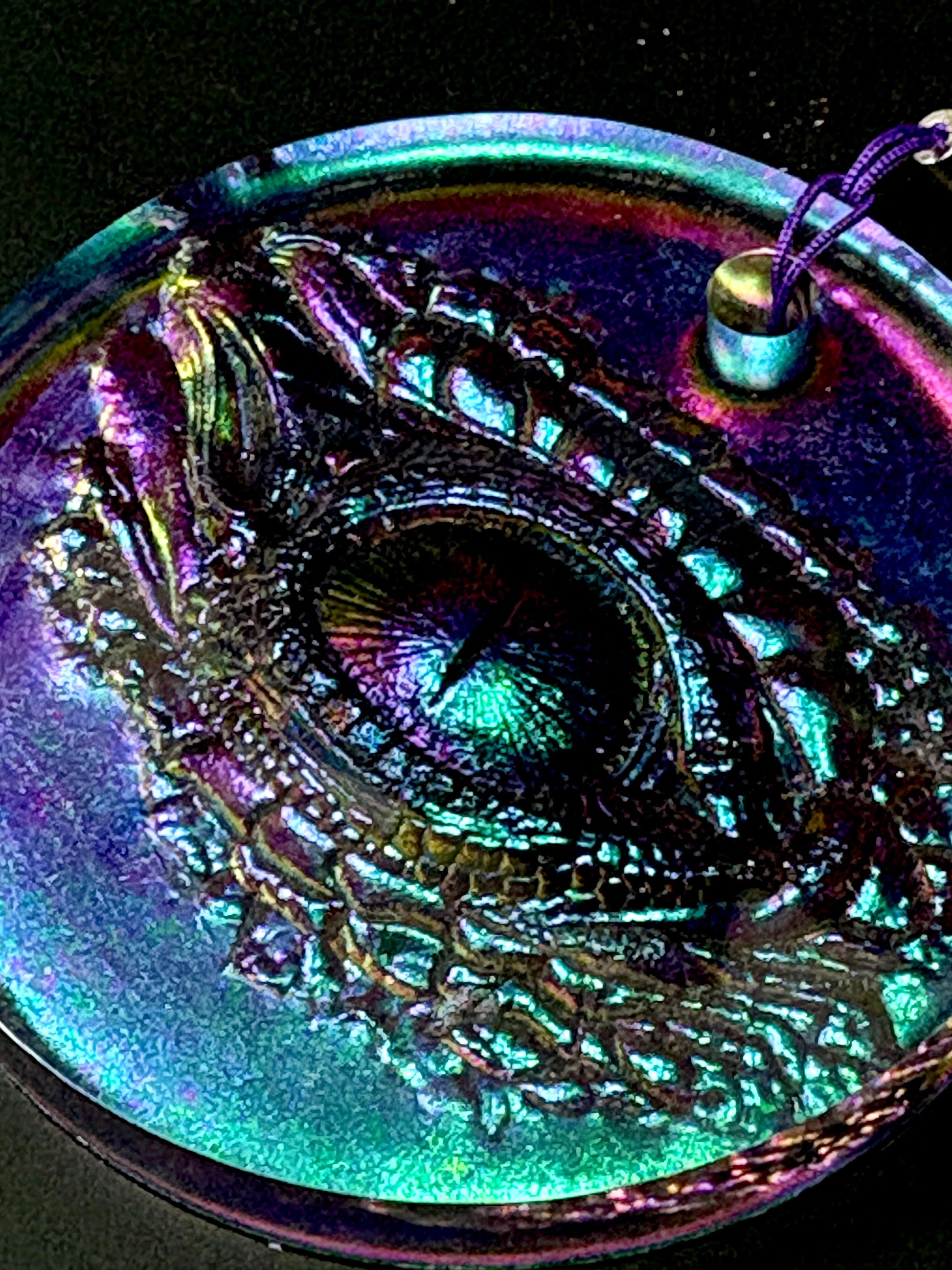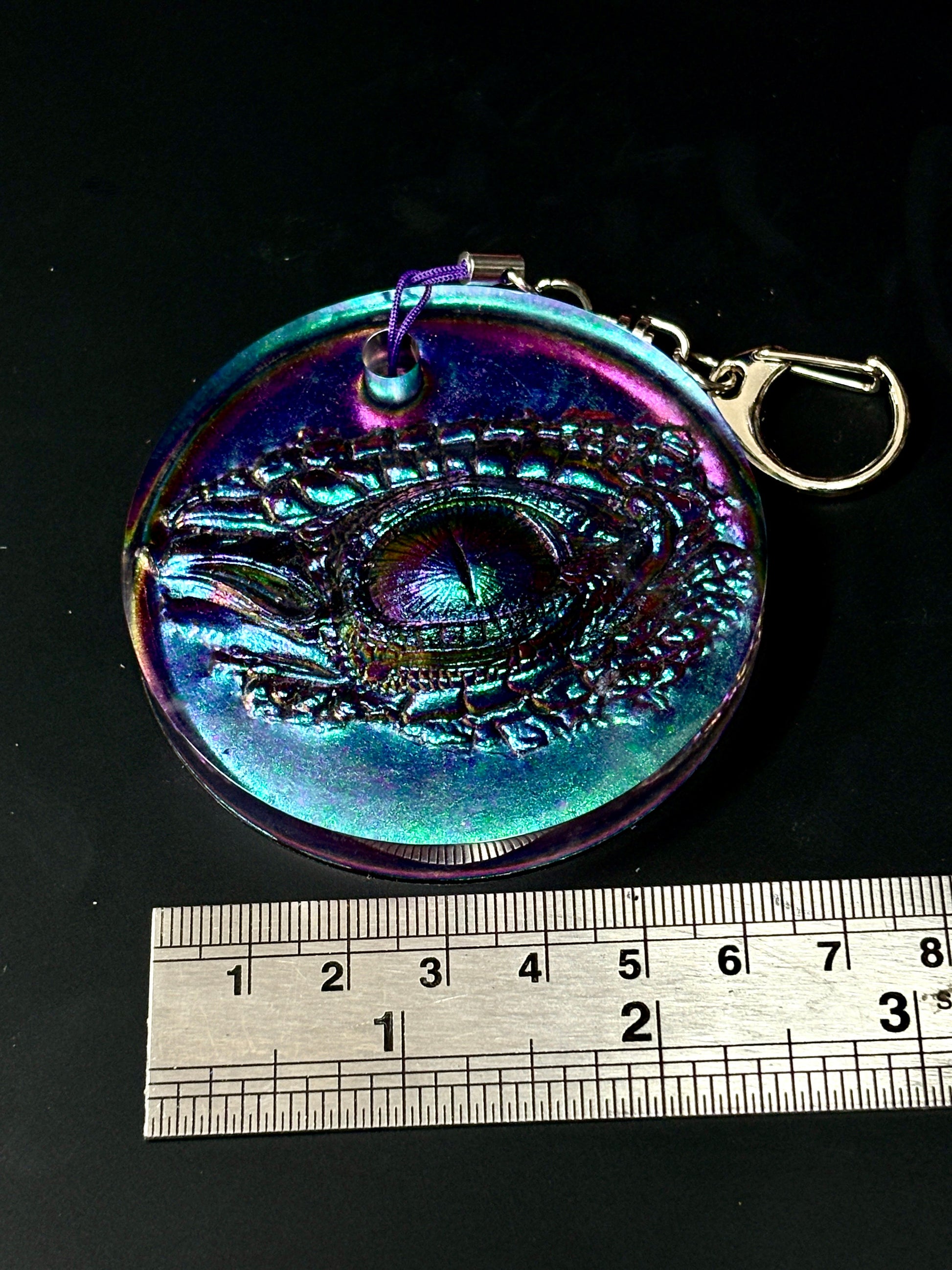 Carry a piece of fantasy magic with you wherever you go with this handmade Dragon Eye bag tie and keyring. Cast in 2-part epoxy resin and finished with shimmering, color-shifting pigments, this unique piece captures the mystery and strength of a dragon’s gaze.