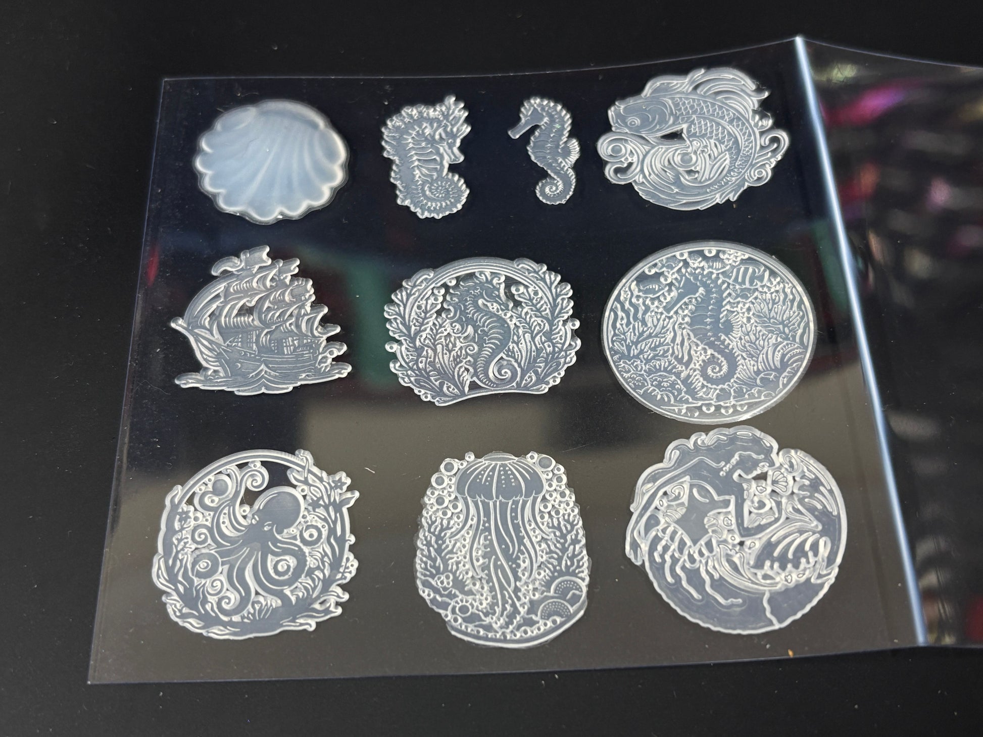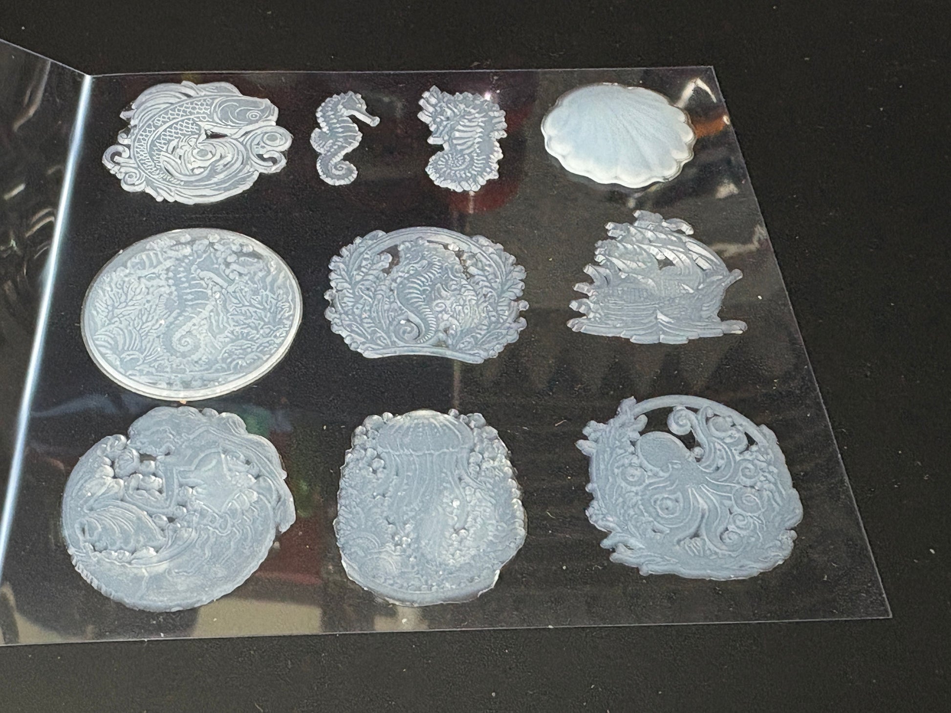 Les incrustations sont montées sur du plastique acrylique de 1 mm pour un stockage et une livraison en toute sécurité.