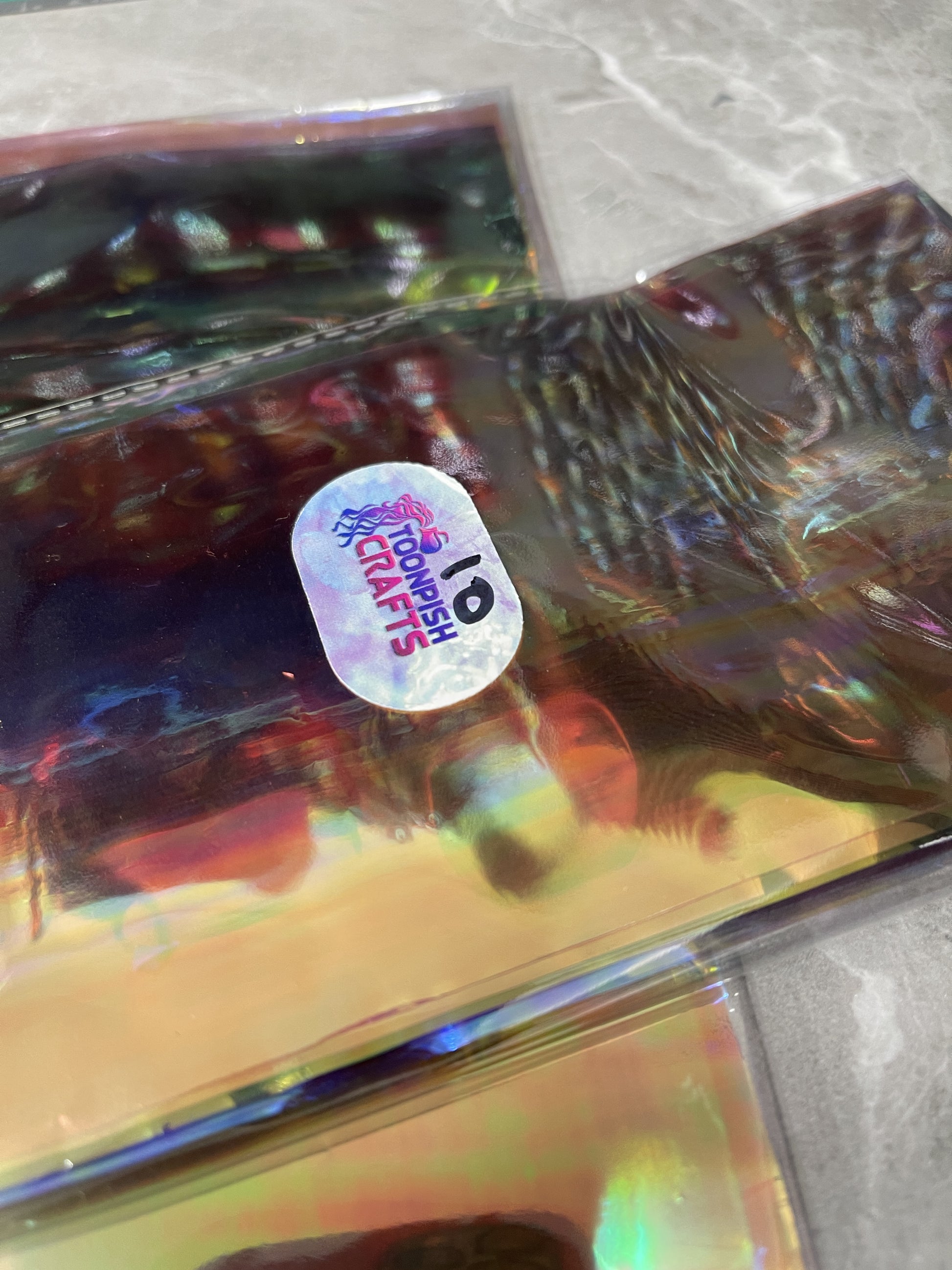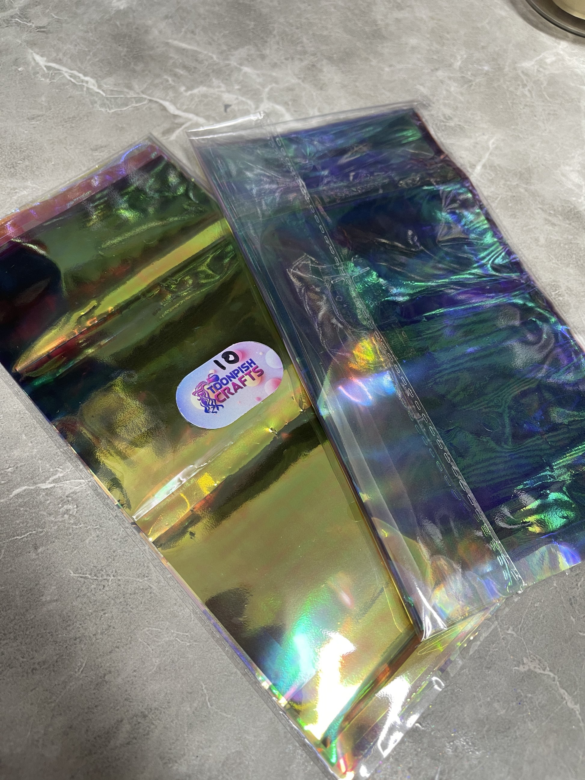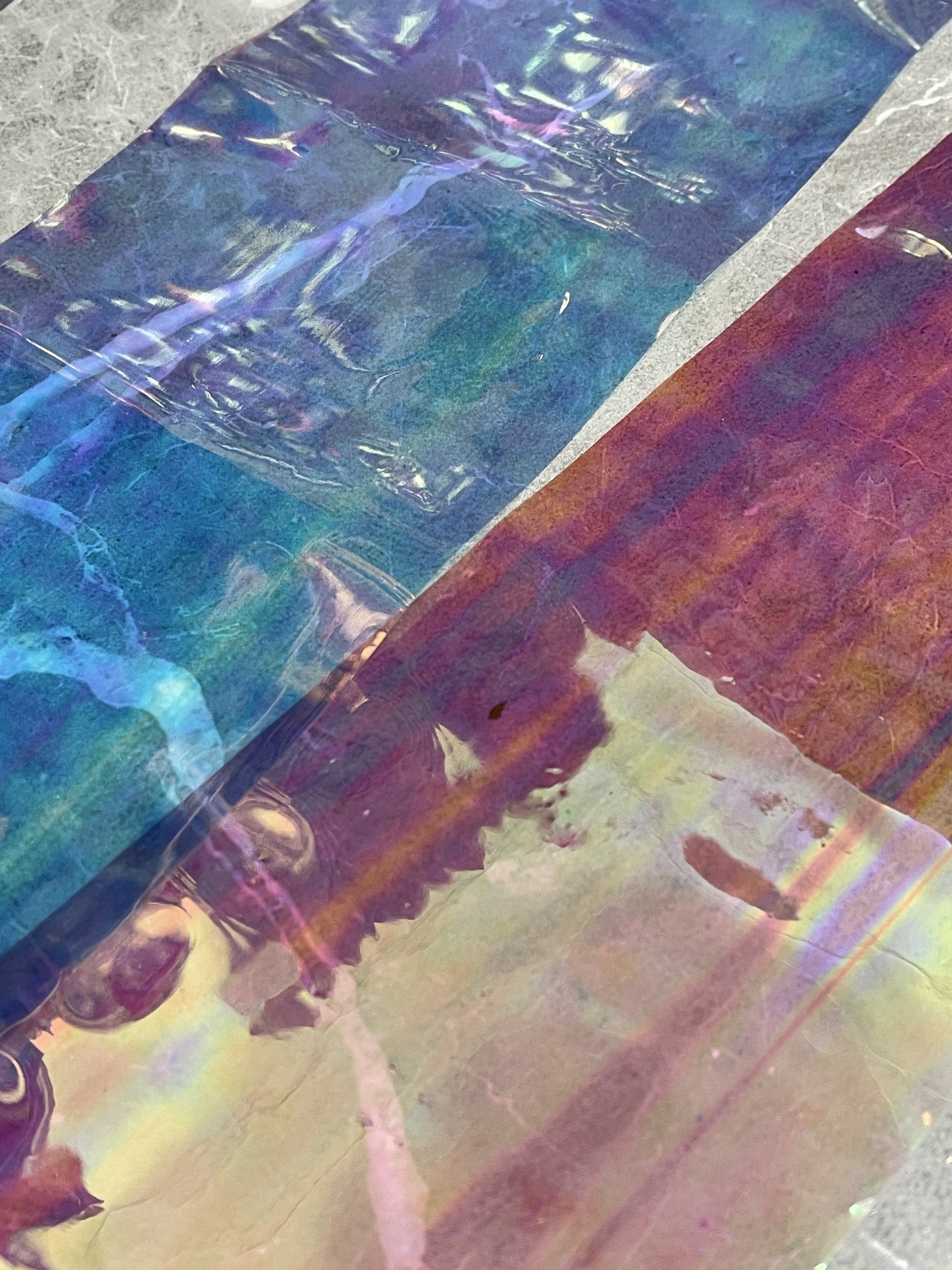 Fusible iridescent film is the raw material for Angelina. This is a reasonably thin, shimmering paper that sticks well to raw clay and to itself when using a hot air gun. It can create beautiful Dichroic patterns.