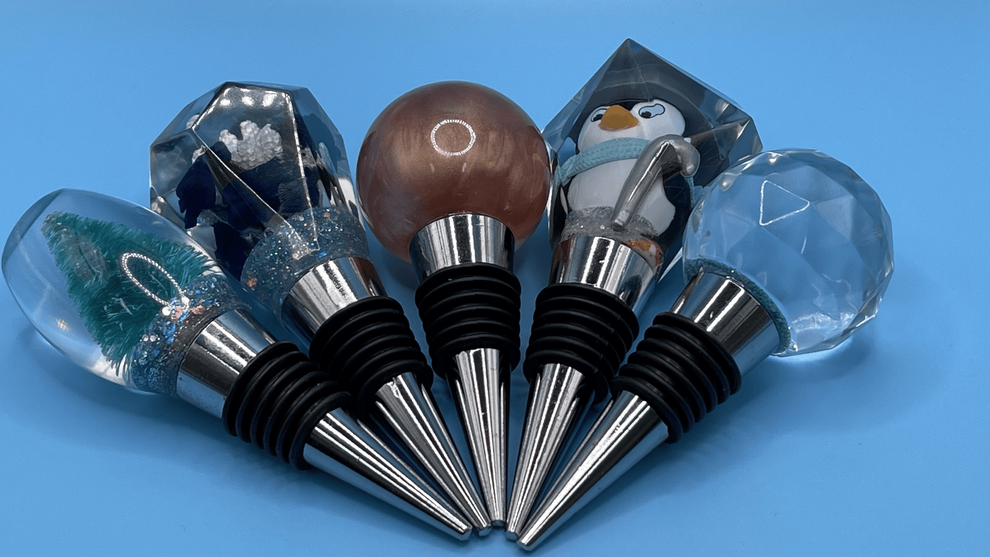 Made from resin and attached to red wine stoppers.