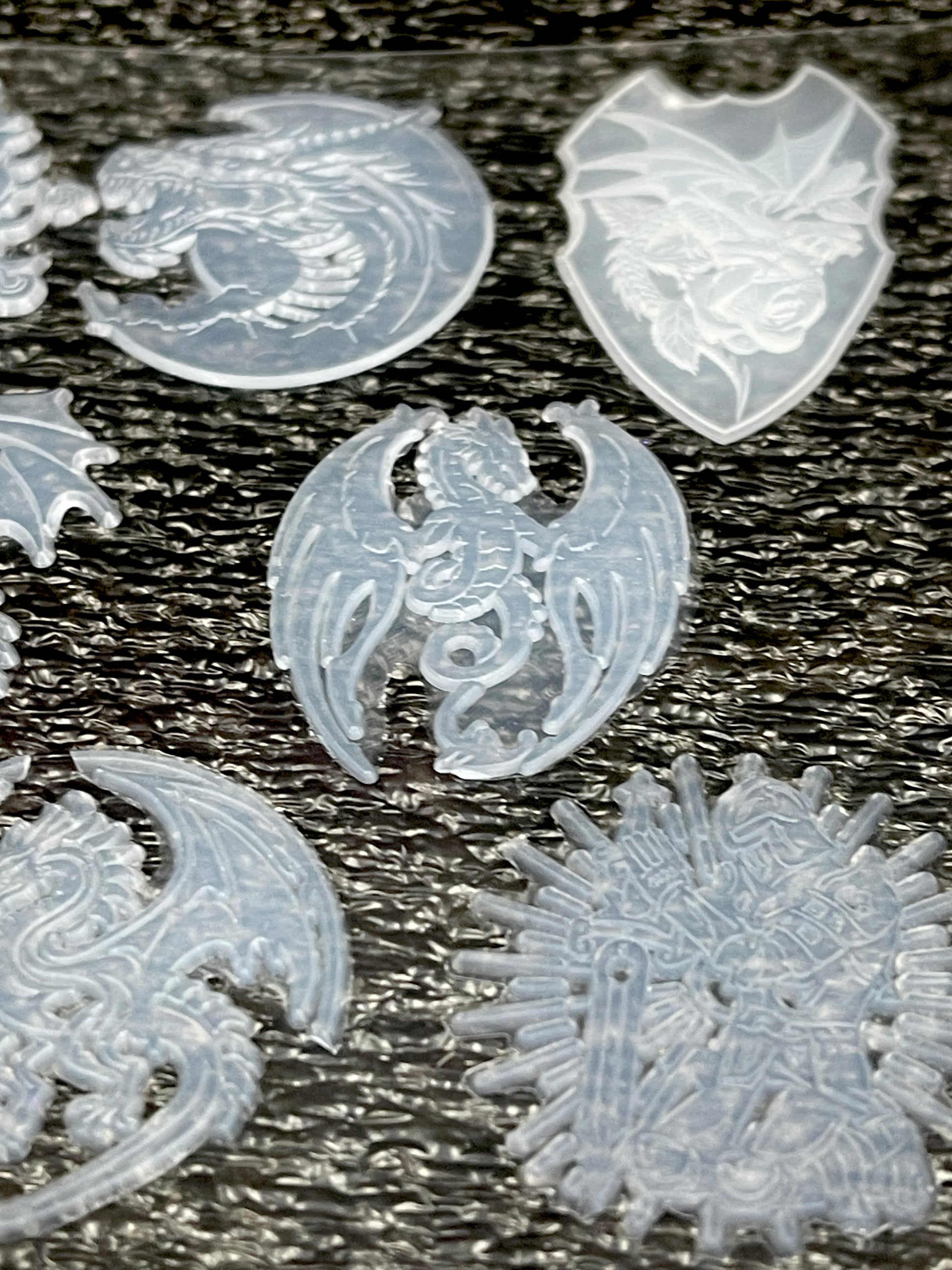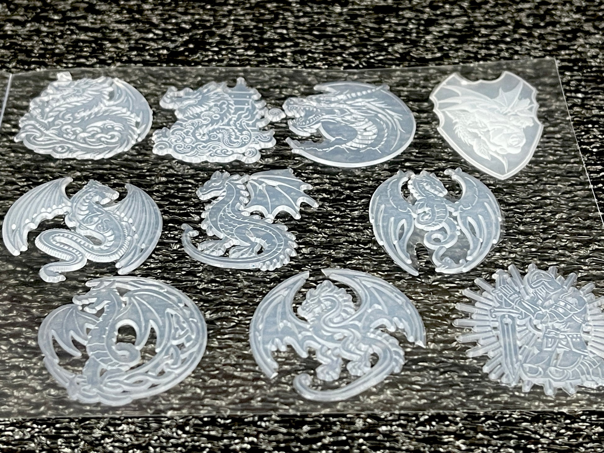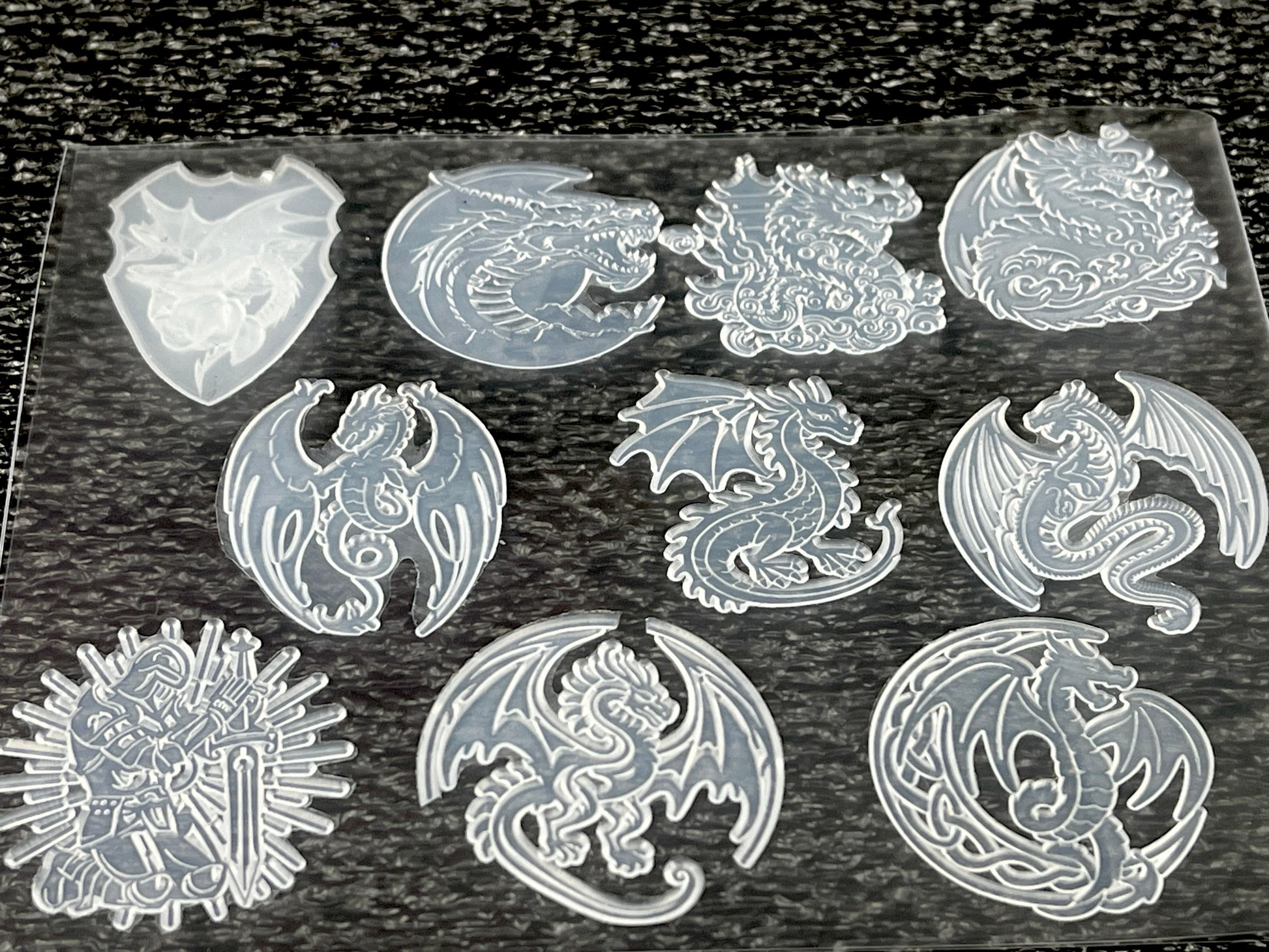 A selection of 8 Dragon and a Knight, tiny silicone inlays without borders and a shielded Dragon.