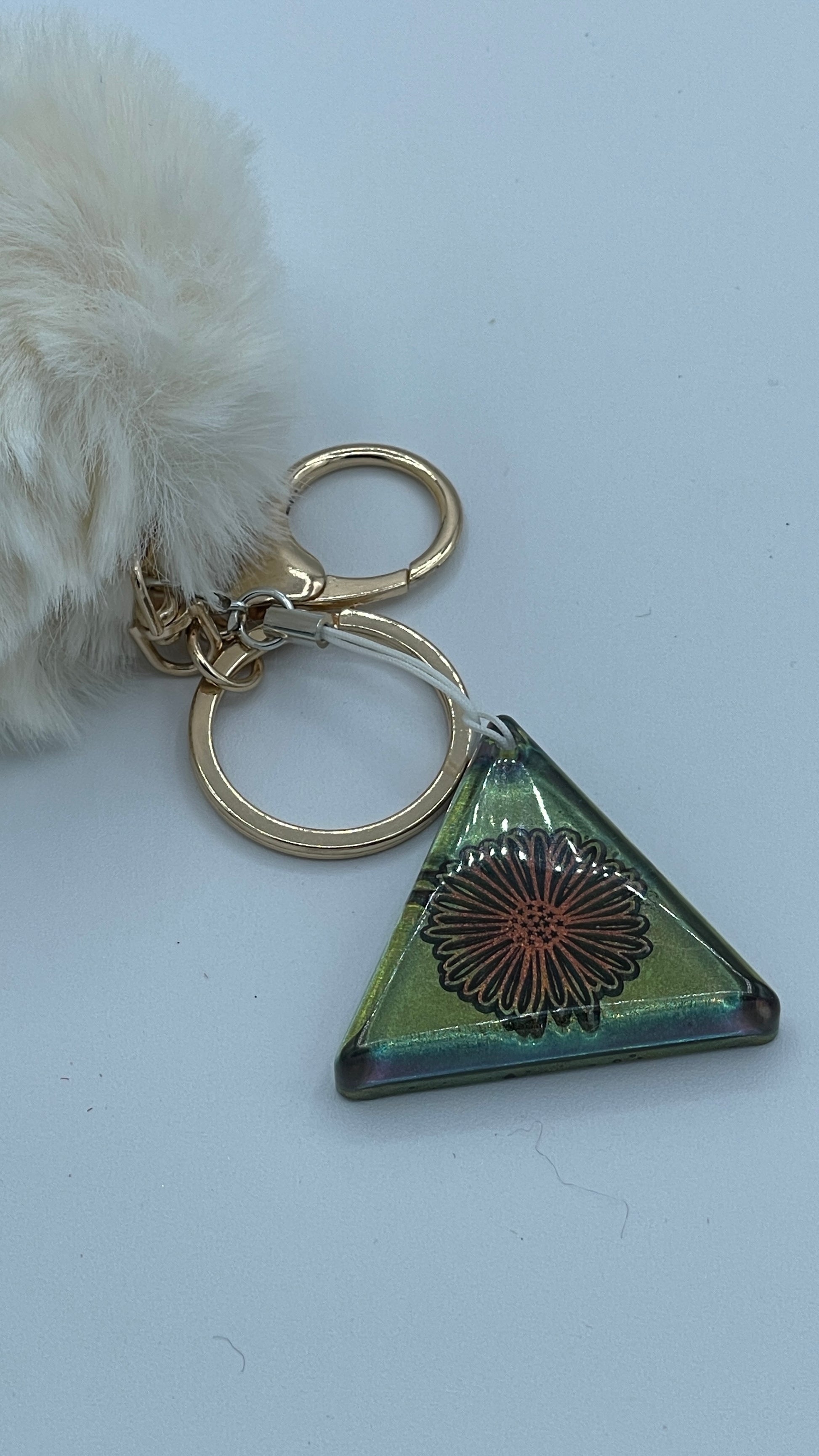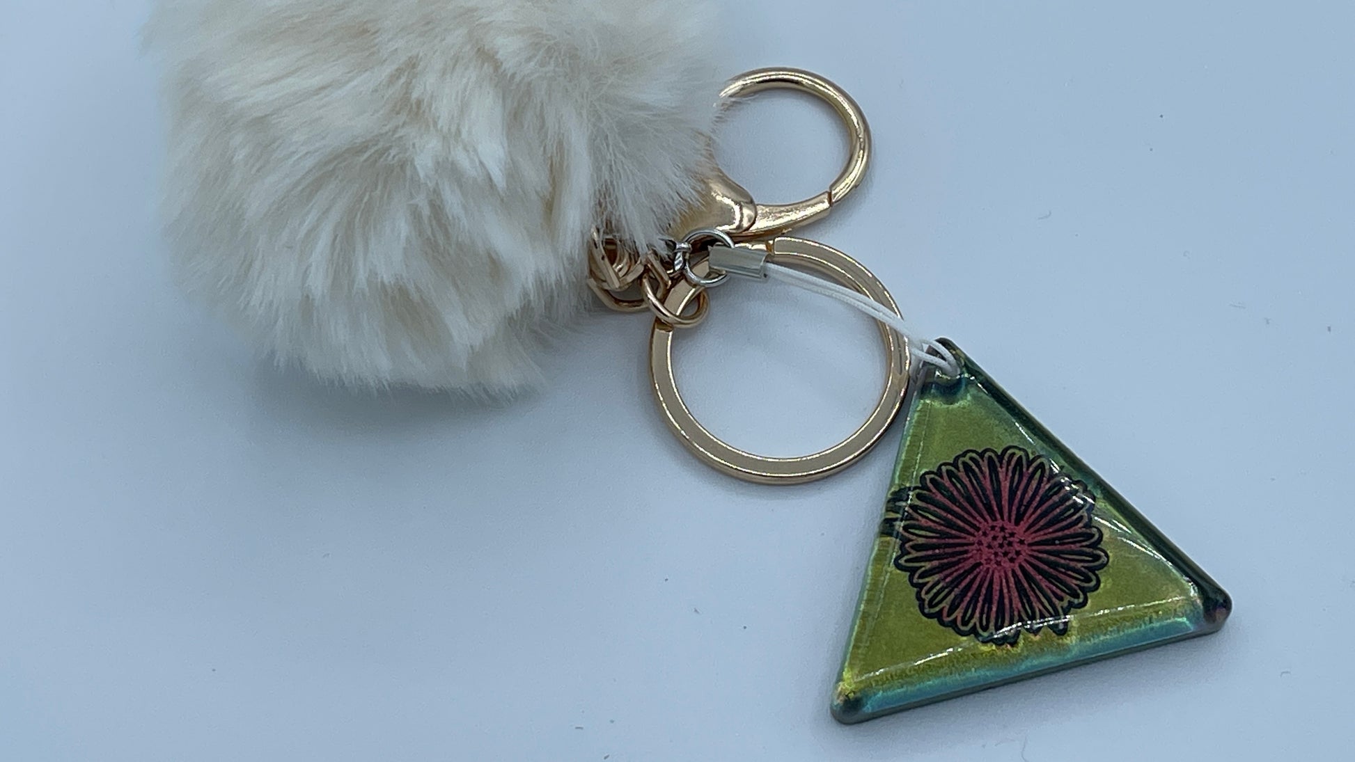 The antique gold coloured keyring is accompanied with a fluffy white ball.