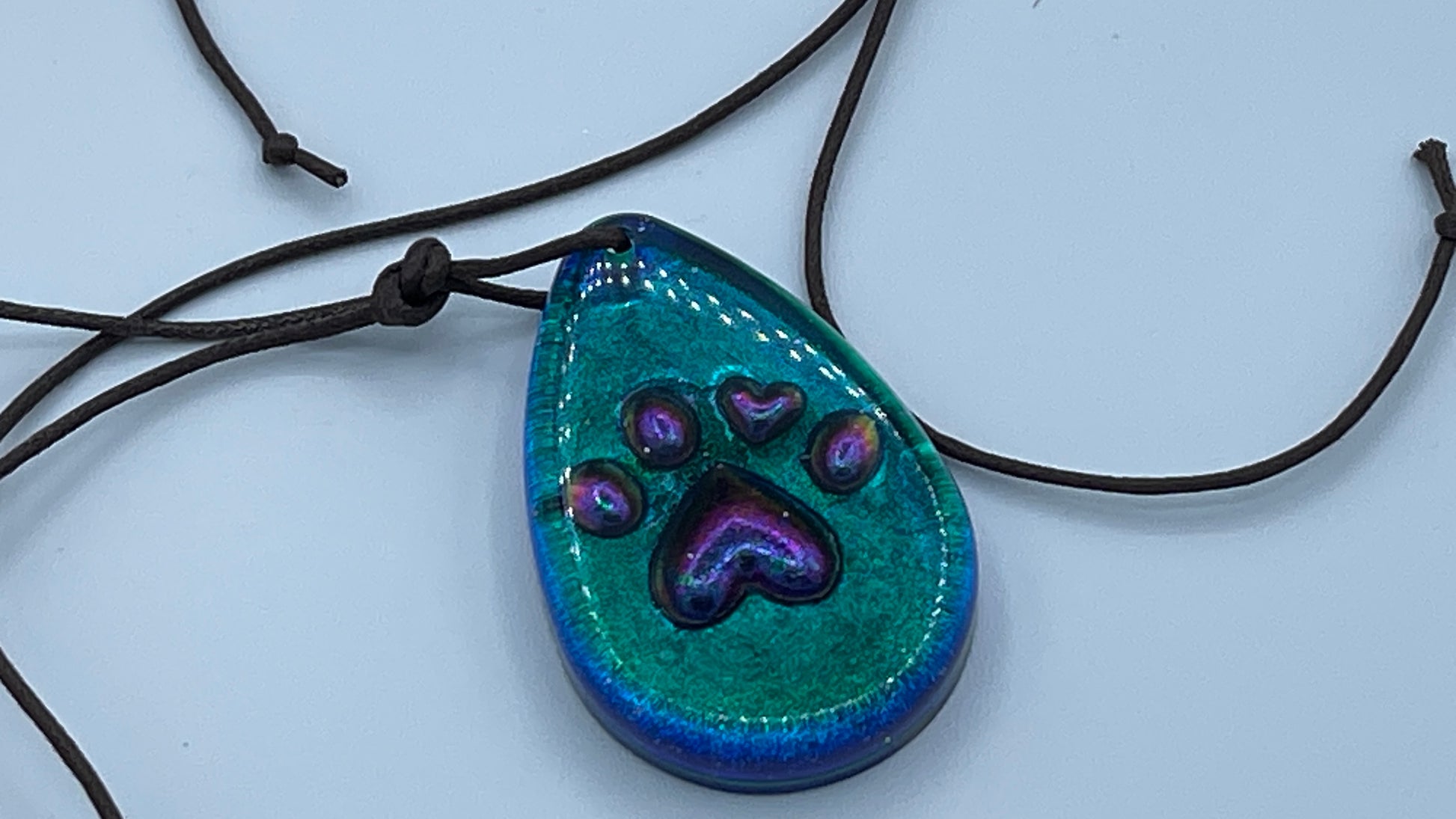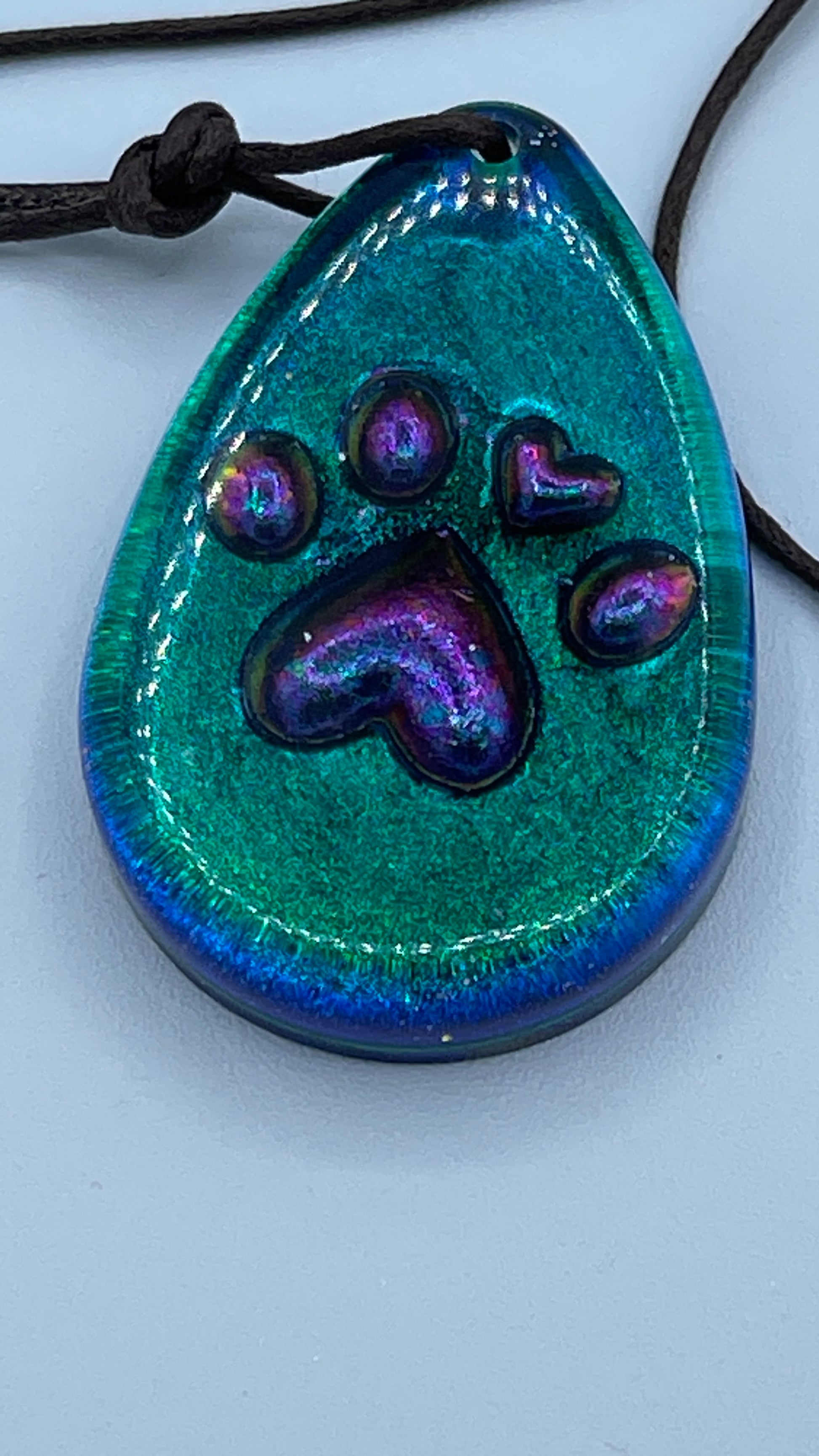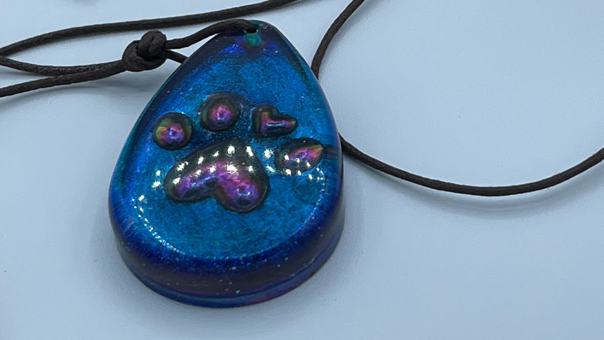 This handmade necklace is made from 2-part epoxy resin and coloured with colour changing (green/blue) pigments that sparkle in the light.