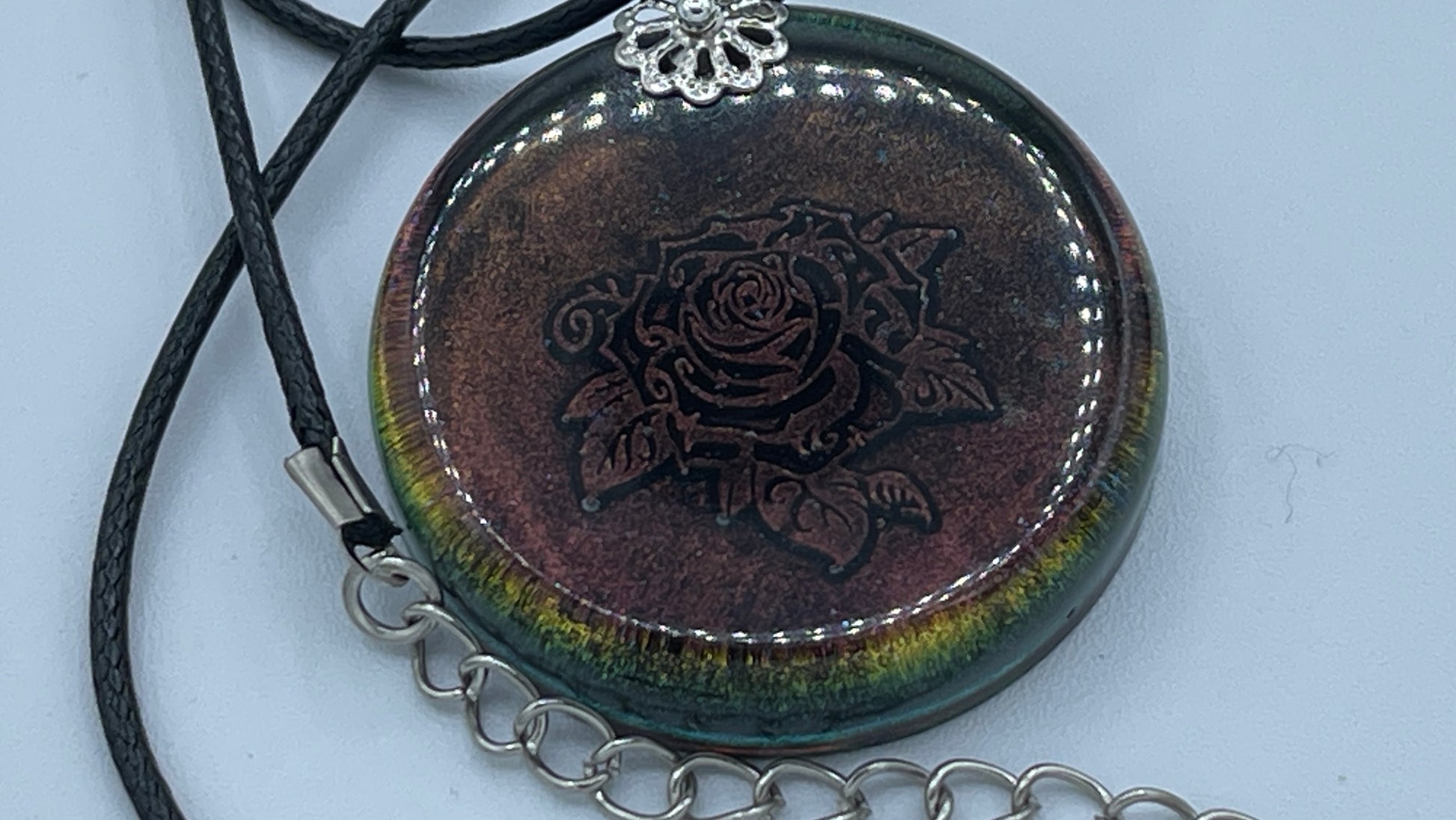 This handmade necklace is made from 2-part epoxy resin and coloured with colour changing (dark pink/gold) pigments that sparkle in the light.