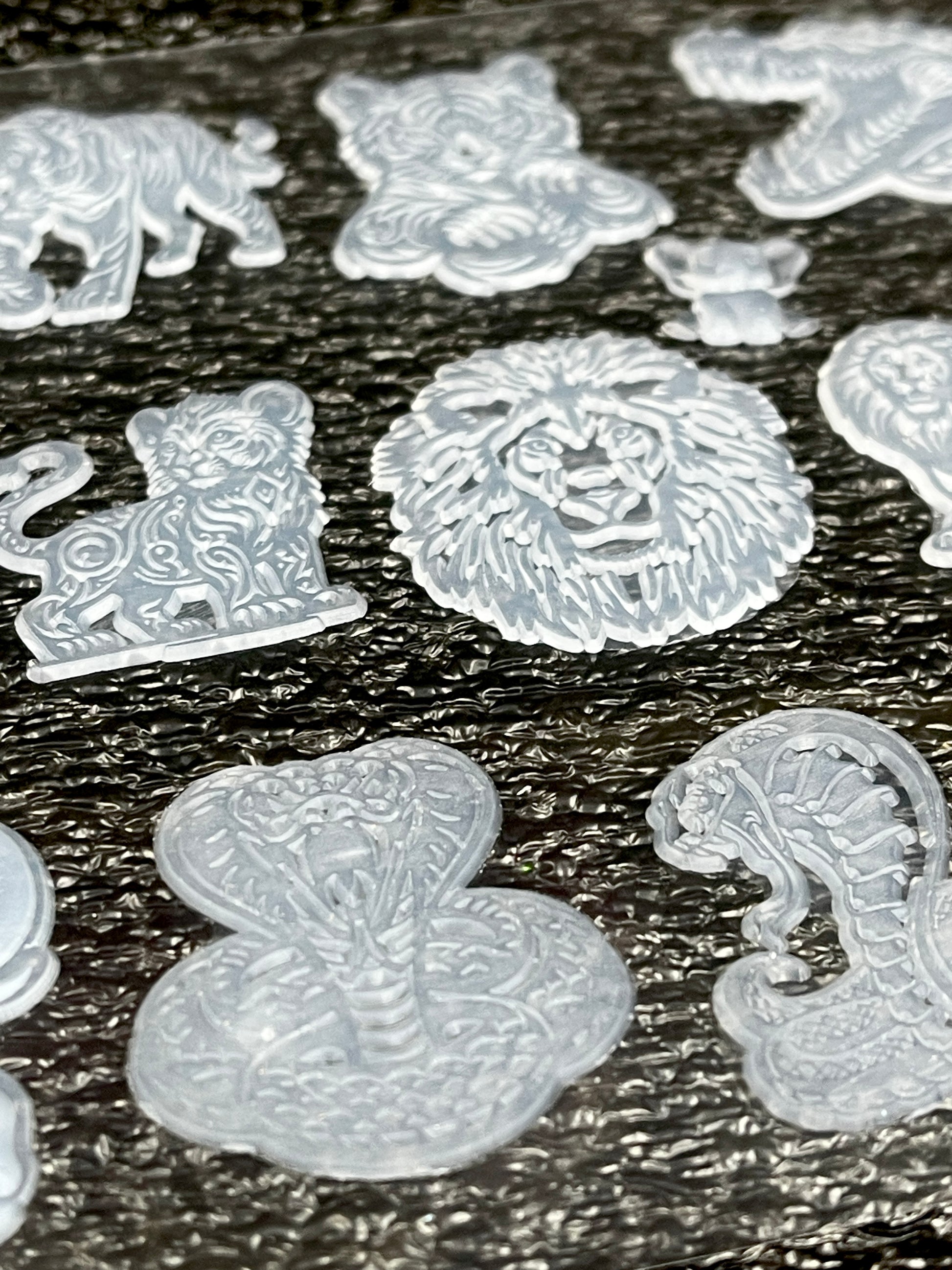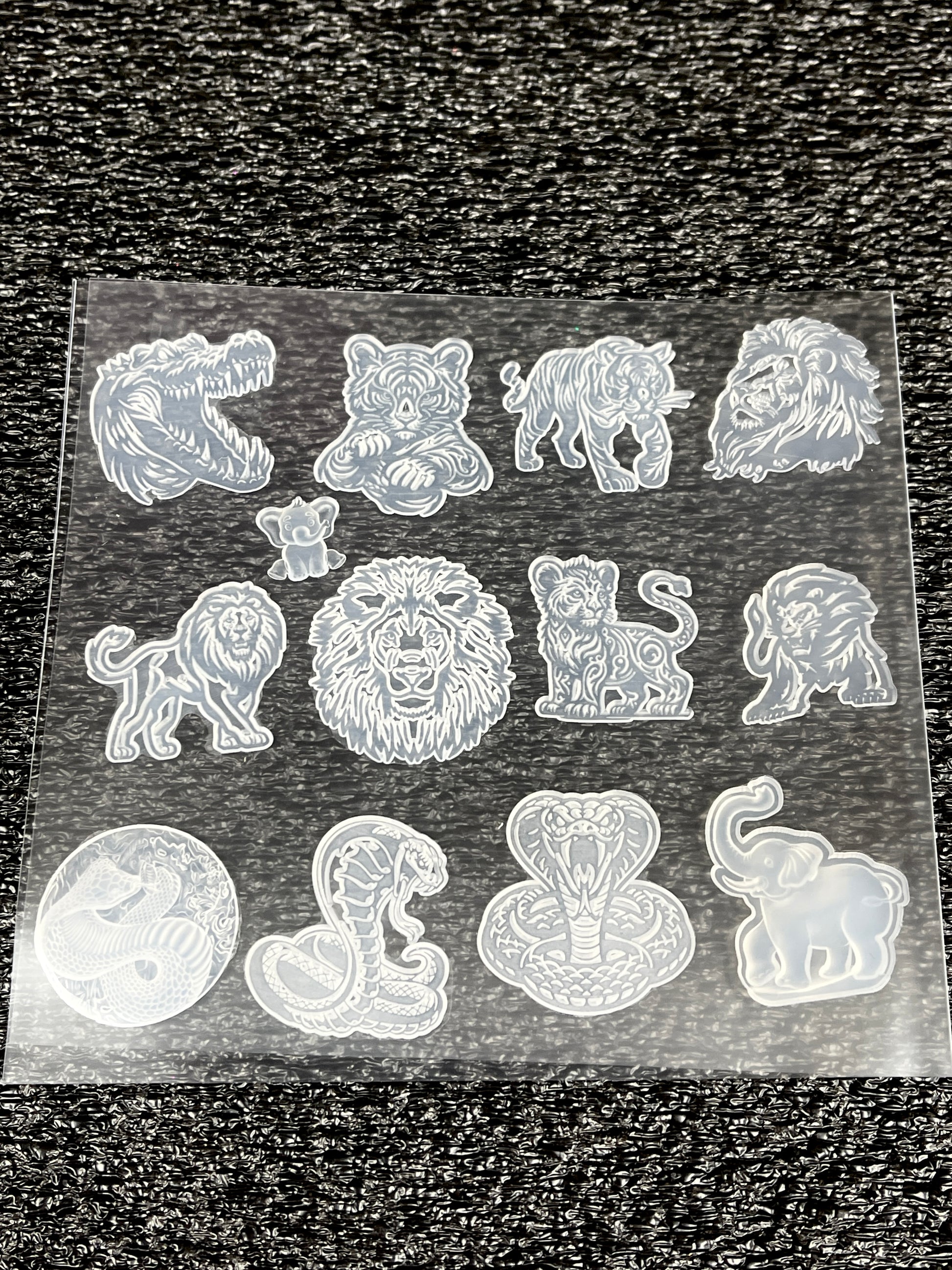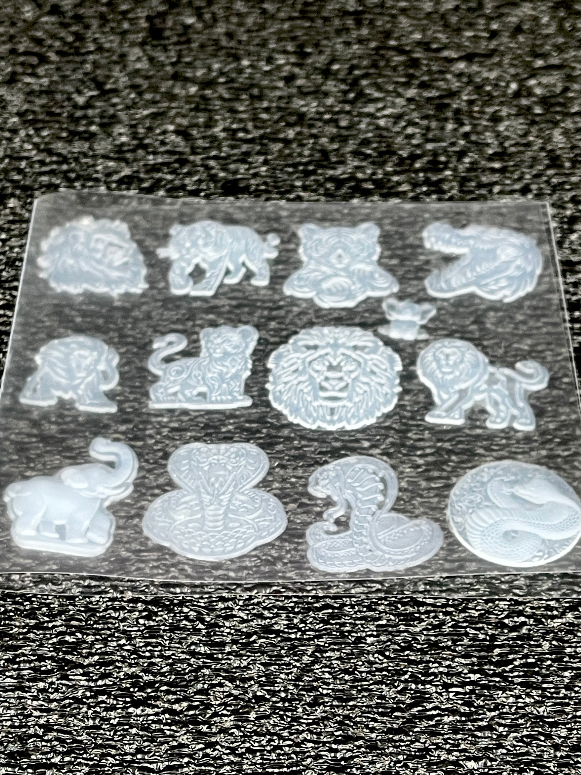 A selection of 12 wild animal and reptile tiny silicone inlays. 2 with and 10 without borders. Plus a free micro Elephant.