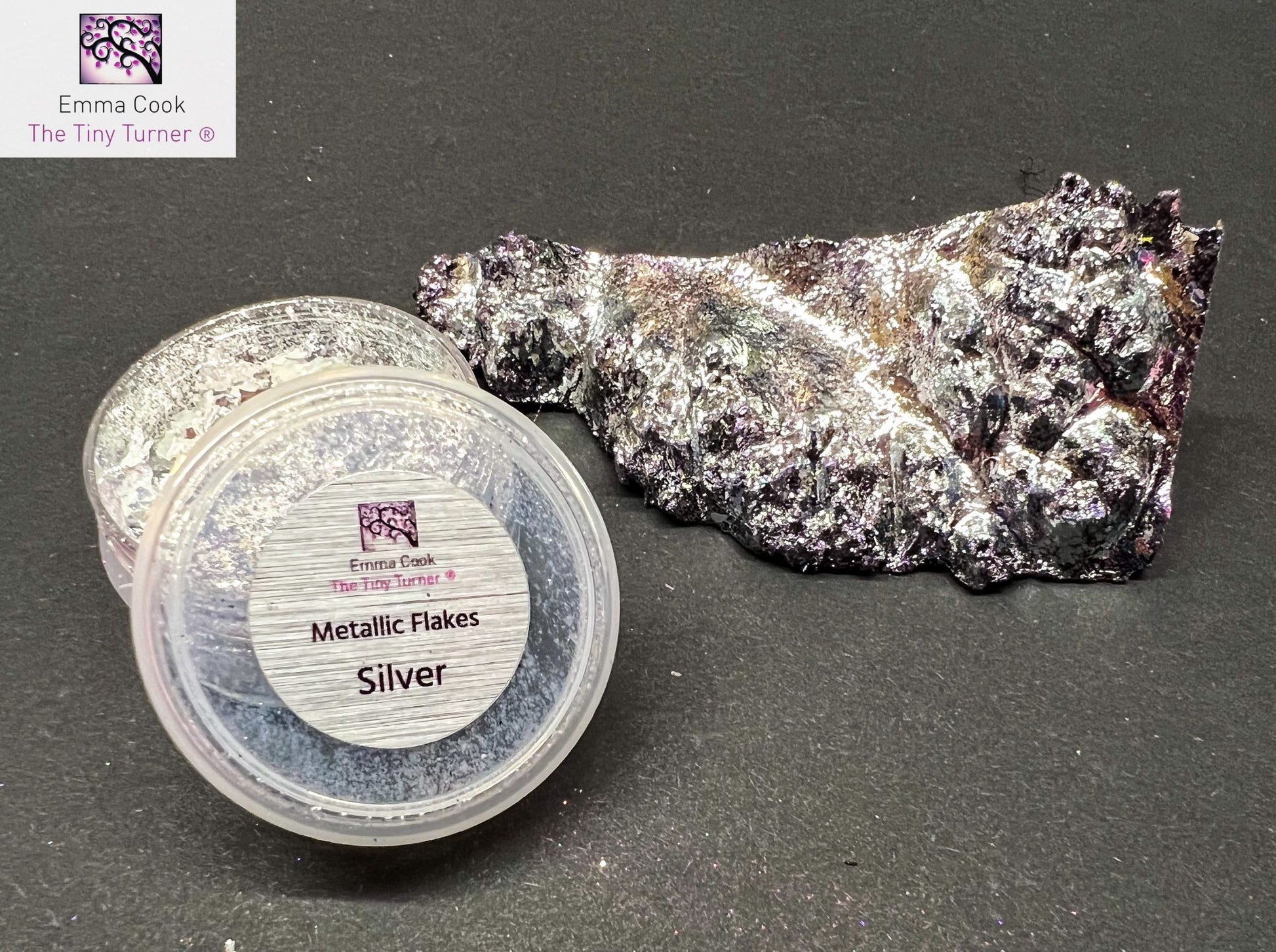 This metallic silver flake is absolutely stunningly bright and is much easier to use than metal leaf. Because it is not genuine silver it does not tarnish either.